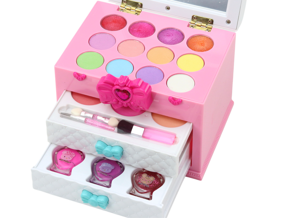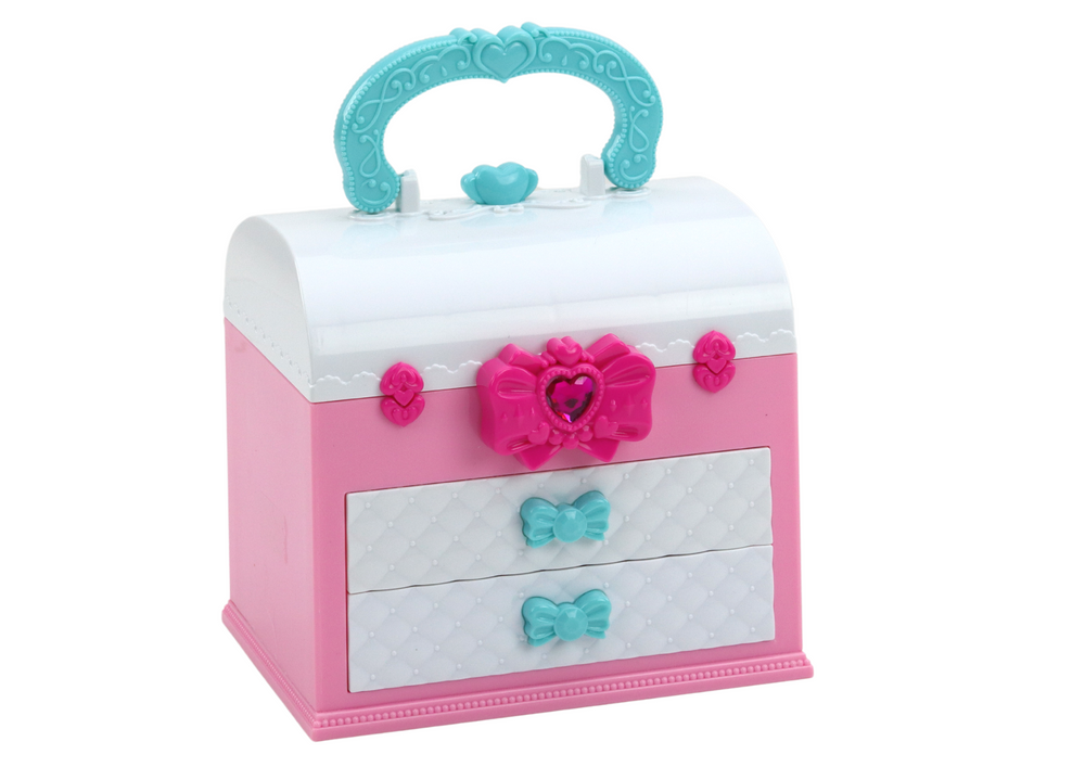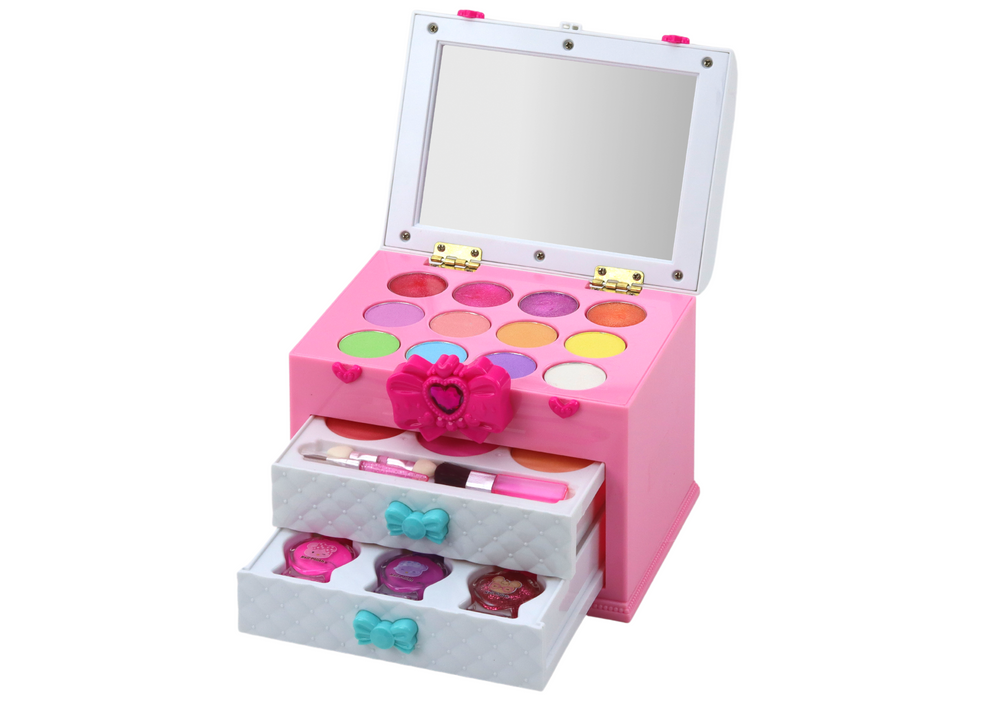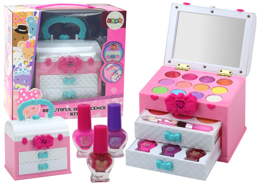 Dodatkowym elementem są dwie szufladki, w jednej z nich znajdują się trzy róże w innym odcieniu i trzy pędzelki, co umożliwia dziecku stworzenie idealnego makijażu twarzy. W drugiej szufladce natomiast znajdują się trzy lakiery do paznokci, które zachęcają do tworzenia kolorowych i fantazyjnych wzorów na paznokciach.