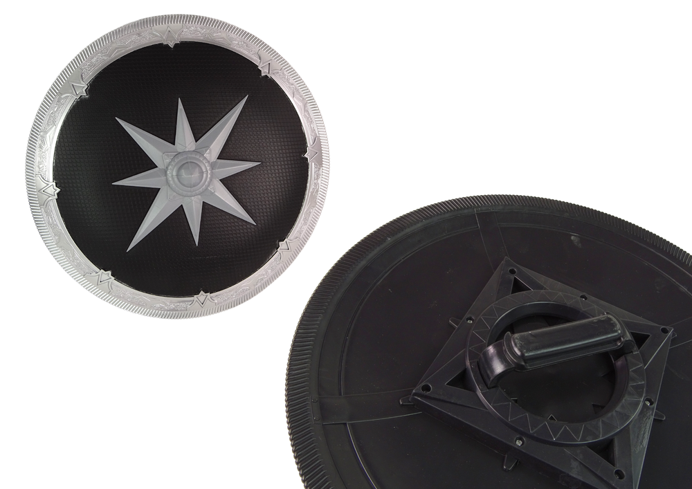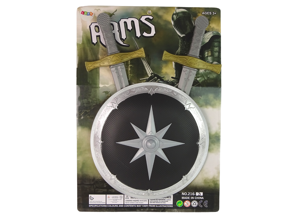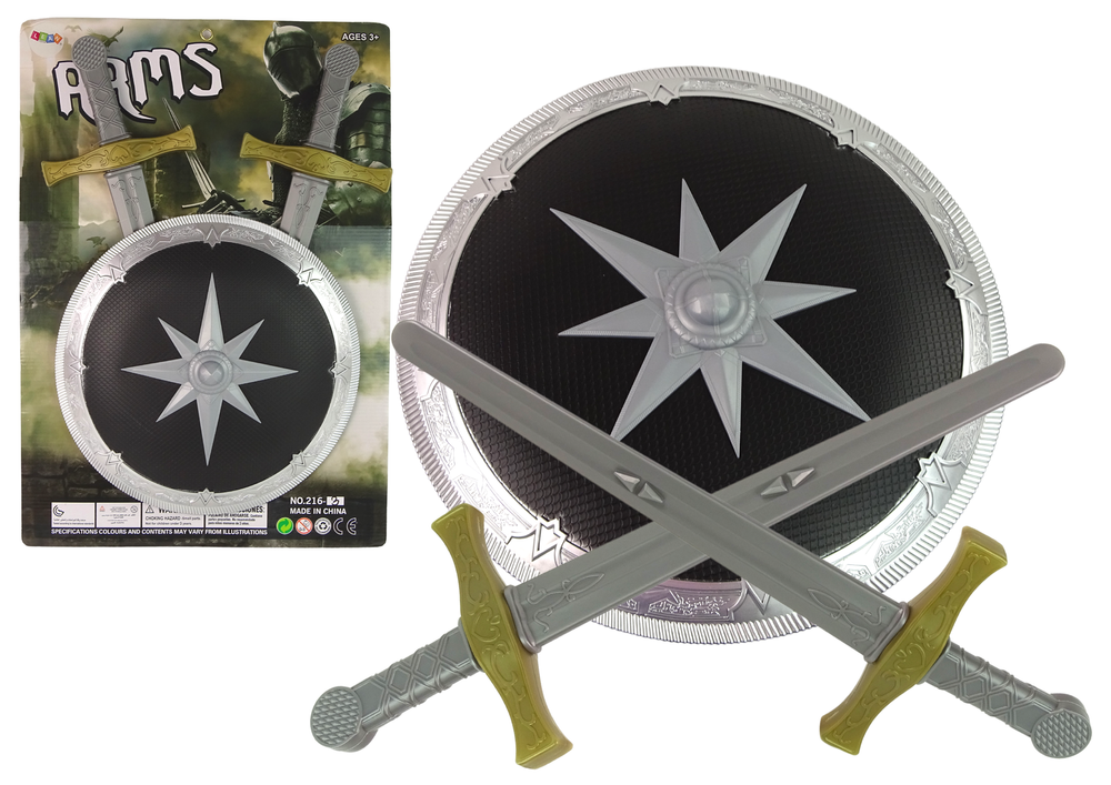 Dwa długie miecze mają wygodną do trzymania rękojeść, utrzymane są w kolorystyce srebrno- złotej. Tarcza ma średnice 38 cm i srebrną, wzorzystą oblamówkę, a na środku odznacza się wielka gwiazda.