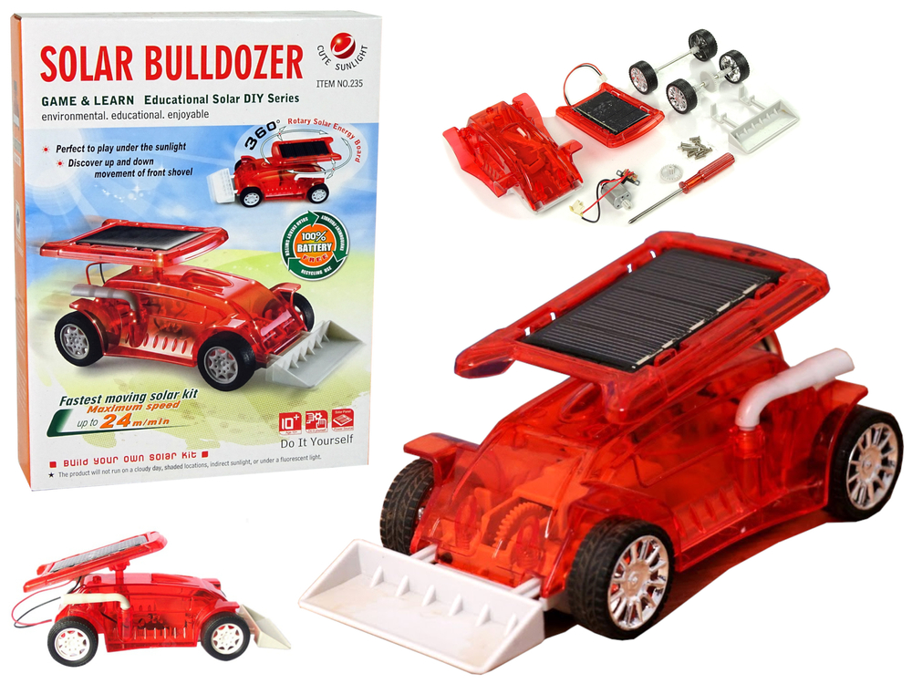 Autko zasilane jest światłem słonecznym. Części autka składane są na zatrzask, nie musisz używać kleju lub innych narzędzi. Najpierw należy złożyć podstawę modułu panelu słonecznego oraz silniczek. Jest możliwość złożenia pozostałych elementów w różny sposób, w zależności jak będzie składany model.