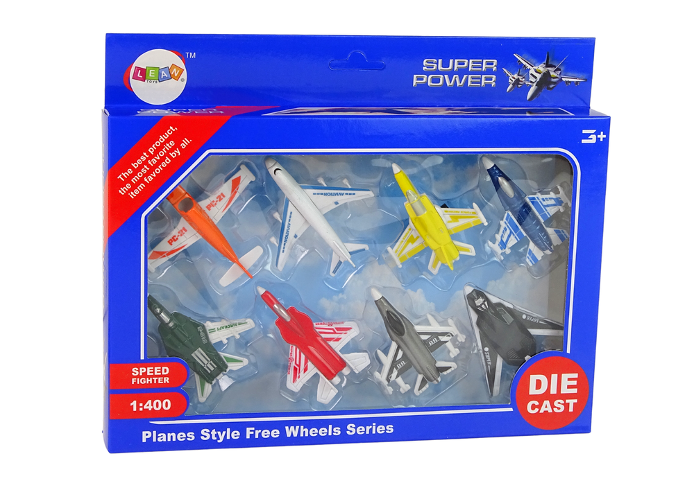 W zestawie znajduje się 8 sztuk samolotów wykonanych w skali 1:400, każdy innego koloru. Wymiary zabawki dostosowane są do rączek małych dzieci, co ułatwia chwytanie i zabawę odrzutowcem.