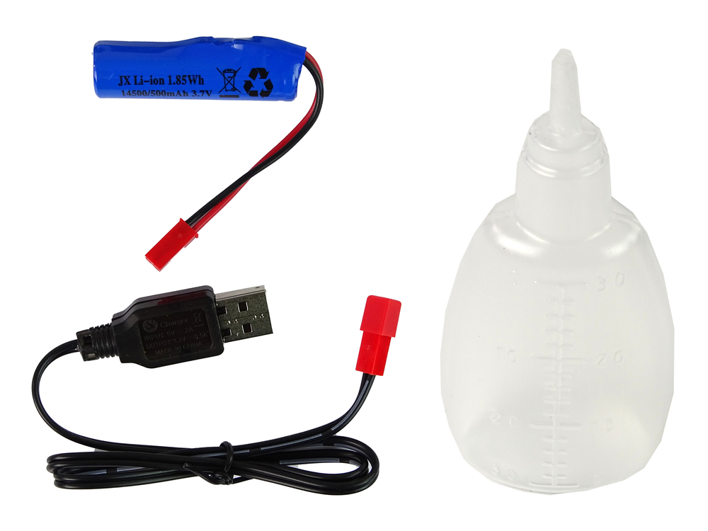 W zestawie znajduje się wszystko, co potrzebne do rozpoczęcia zabawy: kombajn, akumulator 14500/500mAh 3.7V, pilot na 2x 1.5V AAA baterie ( brak w zestawie), buteleczka na wodę oraz kabel USB do ładowania akumulatora.