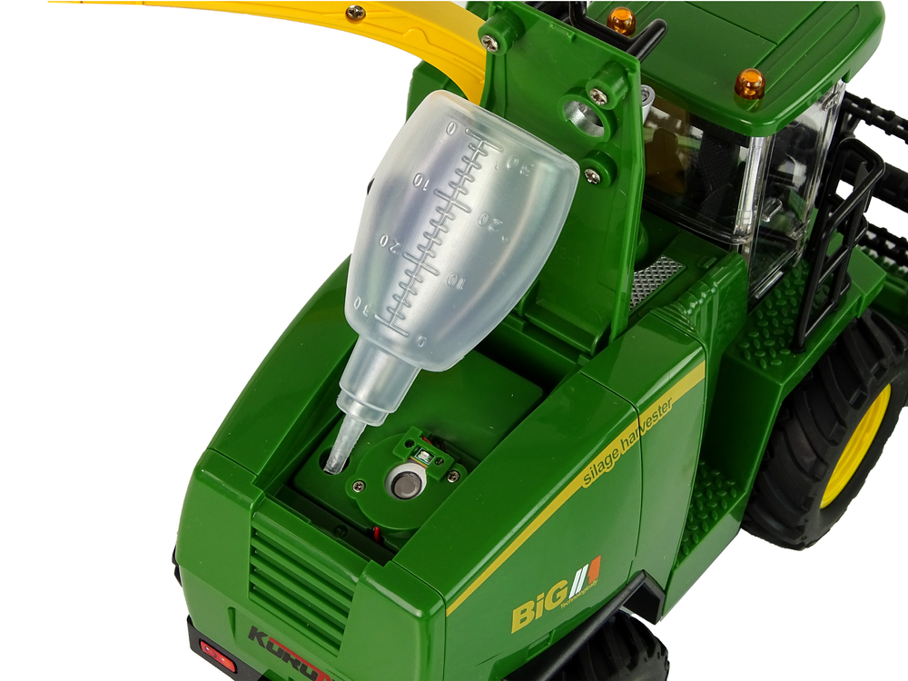 Funkcja zdalnego sterowania umożliwia kontrolę nad kombajnem poprzez pilota, co dodatkowo zwiększa realizm i przyjemność z zabawy. Dodatkowo, kombajn wydziela parę wodną, imitującą spaliny, co nadaje mu autentyczny charakter. W zestawie dołączona buteleczka na wodę w celu uzupełnienia zbiorniczka na wodę.