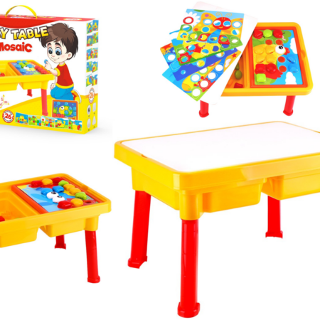 Stolik 2w1 Edukacyjny Układanka Mozaika Guzikowa Zabawka 2 w 1 to idealny przedmiot do zabaw i pobudzenia kreatywności. Dzieci na pewno zainteresują się to zabawką ze względu na różnorodność kolorów, możliwość rozwoju wyobraźni oraz dużą liczbę elementów. Stolik jest funkcjonalny i stabilny o wysokości 27 cm, co pozwoli dzieciom na zabawę na dywanie. Całość stolika podzielona jest na…