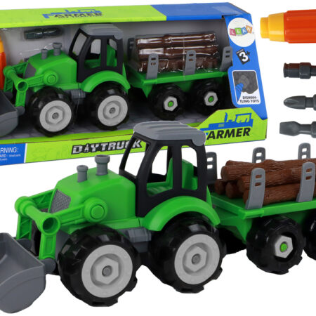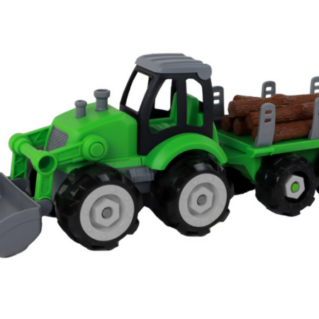 Traktor Koparka Do Rozkręcania Przyczepka Naczepa Z Drzewem Traktor jest zielony, co nadaje mu charakterystyczny i rozpoznawalny wygląd. Ma on przednią łyżkę, która jest interaktywna i umożliwia kopanie oraz transportowanie różnych przedmiotów. Dzięki tej łyżce dzieci mogą odgrywać różne scenariusze związane z pracami rolniczymi i budowlanymi. Zestaw zawiera przyczepę, na której znajduje się…