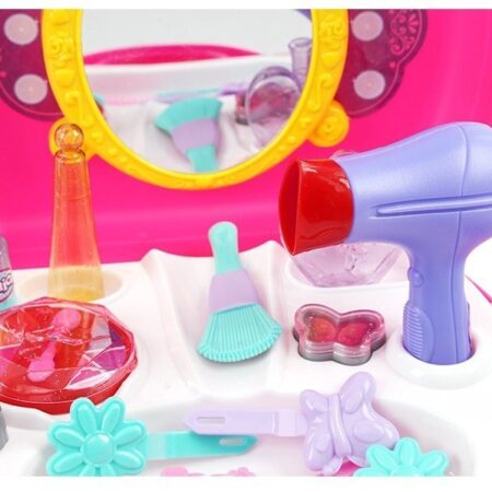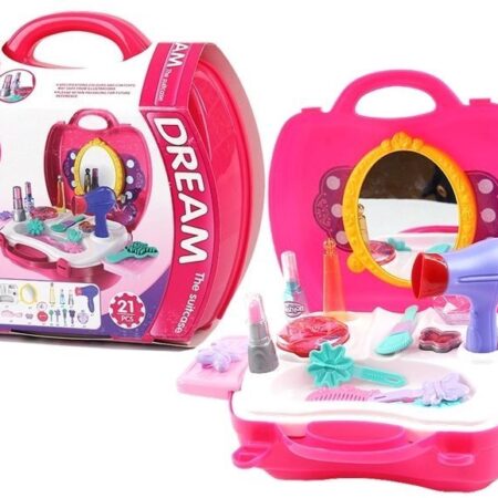 Wspaniały zestaw o zabawy w kosmetyczkę:) Lusterko, kolorowe elementy starannie wykonane zachwycą każdą młodą damę. Całość łatwo zamyka się w walizce, przez co zabawkę można zabrać wszędzie ze sobą. W skład zestawu wchodzi 21 elementów: -walizka -lusterko -suszarka -imitacja perfum -pomadka -cienie do powiek -grzebienie -szczotka -spinki Wymiary walizki: 24cmx23cmx10cm Zestaw to…