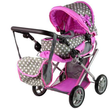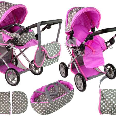 Wózek Spacerówka 2 w1 z Torbą Szaro Różowy Gwiazdki Wózek spacerówka to idealna zabawka dla dziewczynek, które chcą opiekować się swoimi lalkami. Modny kolor i grafika zachęcą do zabawy. Urozmaici zabawę w dom, dzięki czemu każda dziewczynka może poczuć się jak mamusia i spędzać czas ze swoją lalką. Obudzi w sobie opiekuńczość i troskę, pozytywnie…