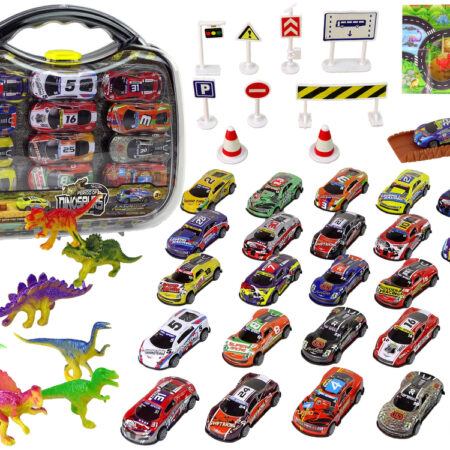 Zestaw Auta Sportowe Resoraki Dinozaury Akcesoria Znaki Drogowe Walizka Sportowe auta i jazda ekstremalna to marzenie małych chłopców, ale także i dużych. Obdarowując kilkulatka zestawem różnokolorowych samochodzików, umożliwiasz chłopcu zabawę w przejażdżki po mieście. Rozbudzisz w nim pasję i zainteresowanie motoryzacją. A może zrealizować wyścig w świecie dinozaurów, pełnym niespodzianek? Wszystkie akcesoria pozwolą stworzyć park z…