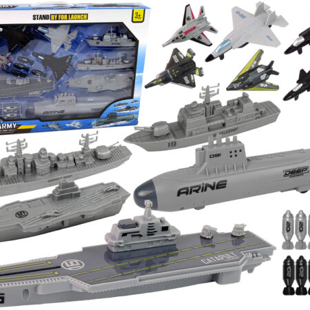Zestaw Armia Morska Łódź Podwodna Odrzutowce Statki Lotniskowiec Bomby Czas rozpocząć bitwę morską ! Cały zestaw okrętów wojennych i odrzutowców pozwoli na taktyczne rozegranie bitwy. Mały strateg pobudzi swoją wyobraźnię. Zestaw jest rewelacyjny dla wszystkich fanów wojsk i żołnierzy oraz tych niezwykłych sprzętów. Odrzutowce mają charakterystyczne oznaczenie w wojskowych barwach. Podczas wojny mogą kontrolować sytuację…