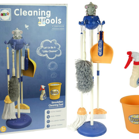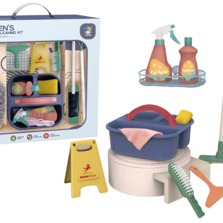 Zestaw do sprzątania 11w1 dla dzieci Cleaning Set Bogato wyposażony zestaw do sprzątania 11w1 jest świetną propozycją dla dzieci od 3-go roku życia. W skład wchodzi: miotła na długim kiju, mop paskowy i mop płaski, wiadro, szufelka z łopatką, opakowanie proszku do czyszczenia (imitacja), Butelka ze spryskiwaczem, gąbka, ściągaczka do szyb, plan sprzątania, kartonowa kałuża…