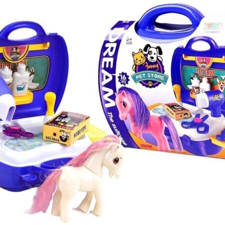 Wspaniały zestaw do zabawy w stylistę zwierzaków 🙂 Teraz każde dziecko w zupełnie bezpieczny sposób może zająć sie swoim pupilem. Całość łatwo zamyka się w walizce, przez co zabawkę można zabrać wszędzie ze sobą. W skład zestawu wchodzą 16 elementy: -walizka – suszarka -nożyczki -szczotka -piesek -środki do pielęgnacji -prysznic Wymiary walizki:…