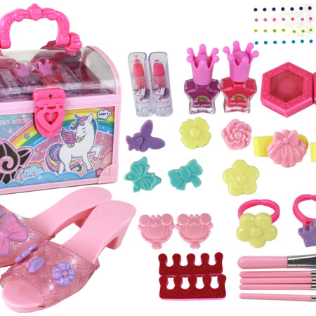 Zestaw Kosmetyków Do Makijażu DIY Akcesoria Kuferek Kuferek ma różowy kolor z pięknym motywem jednorożca, co nadaje mu uroku i dziewczęcej estetyki. Posiada różową rączkę transportową, co ułatwia przenoszenie i zabieranie zestawu w podróż. Zamykanie kufra wykonane jest w kształcie serduszka, co dodaje mu romantycznego wyglądu. Zestaw zawiera różowe klapki na obcasie, które umożliwiają dziecku…