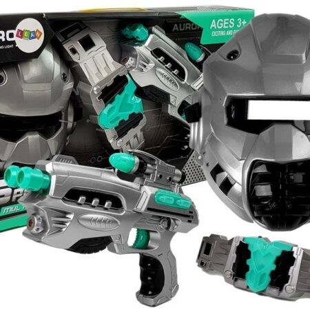 Zestaw Kosmiczny Pistolet Maska Pas Świetlny Dźwięk Mali fani filmów science-fiction mogą nabyć swój własny zestaw, dzięki któremu będą mogli się przenieść wyobraźnią w świat przestrzeni kosmicznej i odbywać w nim swoje pojedynki. W zestawie znajduje się pistolet, który po naciśnięciu spustu wydaje odgłosy strzelania, dodatkowo ma efekty świetlne, a lufa pistoletu porusza się w…
