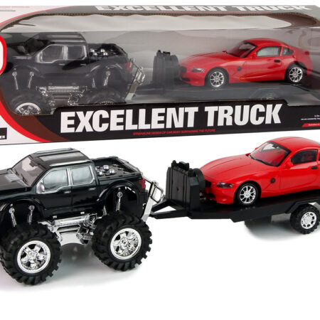 Zestaw Pojazdów Czarny Monster Truck Białe BMW Laweta 58 cm Auto terenowe, dla którego żadna przeszkoda nie jest straszna. Doskonale spisuje się zarówno na asfalcie, jak i na nierównych kamieniach. Zestaw stworzony dla miłośników samochodów, ponieważ zawiera aż dwa samochody w różnych stylach. Pierwszy z nich to czarny MONSTER TRUCK, który ma możliwość przypięcia lawety,…