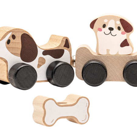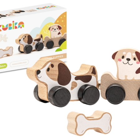 Drewniana Zabawka Mądre Pieski Kość 15443 Ten wspaniały piesek to niesamowita drewniana zabawka. W skład zestawu wchodzi piesek, przyczepa, szczeniaczek oraz kość. Elementy drewnianej zabawki możemy wprawiać w ruch. Zabawka umożliwia dziecku przewóz szczeniaczka bądź kości na przyczepie. Do produkcji zabawek producent wybiera najlepsze rodzaje drewna i wykorzystuje nietoksyczne farby na bazie wody. Wszystkie zabawki CUBIKA…