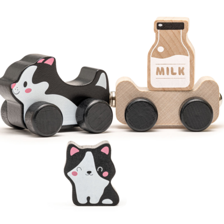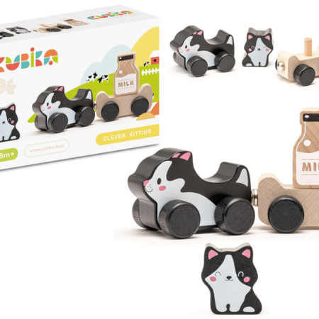 Drewniana Zabawka Mądre Kotki Mleko 15450 Ten wspaniały kotek to niesamowita drewniana zabawka. W skład zestawu wchodzi kot, przyczepa, mały kotek oraz mleko. Elementy drewnianej zabawki możemy wprawiać w ruch. Zabawka umożliwia dziecku przewóz małego kota bądź mleka na przyczepie, dzięki magnesom. Do produkcji zabawek producent wybiera najlepsze rodzaje drewna i wykorzystuje nietoksyczne farby na bazie wody….