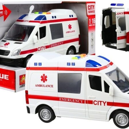 Ambulans z napędem frykcyjnym białe 1:20 z dźwiękiem Interaktywna zabawka Ambulans medyczny jest potrzebny każdej ekipie ratunkowej. Zapewne znajdzie zastosowanie u małego przyszłego lekarza, ratownika medycznego lub kierowcy. Dzięki ambulansowi mały lekarz będzie mógł poczuć się jak prawdziwy profesjonalista. Idealnie odwzorowany ambulans. Pojazd posiada dźwięki oraz efekty świetlne, włączane przyciskiem umieszczonymi na dachu pojazdu. Auto…