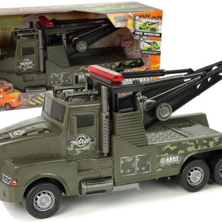 Auto Ciężarówka Holownik Pomoc Drogowa 1:10 Lina Brązowy Przedstawiamy plastikowy holownik przydatny na dziecięcej budowie lub kraksy na drodze. Wspólna zabawa z tym przedmiotem doskonale wpłynie na Twoją pociechę, rozbudzi ciekawość i zachęci do aktywnej zabawy. Całe autko ma kolor brązowy z naklejkami wojskowymi. Każdy szczegół jest idealnie odwzorowany. W tylnej części autka znajduje się dźwig…