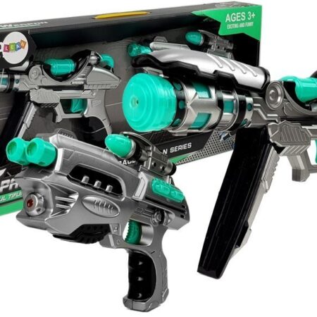Dwa Pistolety Kosmiczne Efekty Dźwiękowe Świetlne Zestaw dwóch rodzajów kosmicznej broni, niezbędne przy walce z kosmicznym przeciwnikiem. Wygląd i funkcjonalność na pewno zachęci do zabawy. Pistolety występują w kolorystyce srebrno-czarno – turkusowej. W jednej z broni można zmienić jej wygląd, otwierając górną lub dolną cześć. Po naciśnięciu spustu pojawiają się efekty dźwiękowe i falowo świecą diody. Drugi…