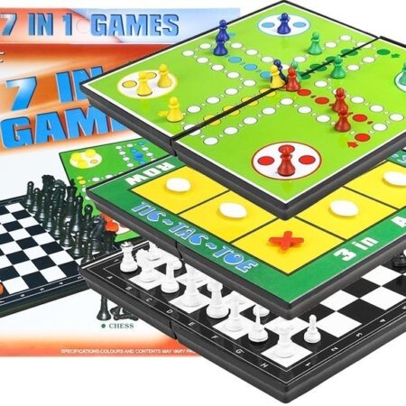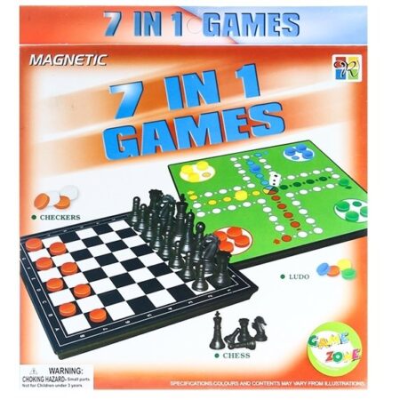 ZESTAW GIER 7W1 W zestawie znajduje się: – zamykana plastikowa plansza do gry w chińczyka oraz 6 wymiennych plansz – figurki do gry w szachy – żetony (czarne, czerwone) – kolorowe pionki (niebieski, żółty, czerwony, zielony) – 2 kostki 1. Szachy – gra odbywa się na szachownicy 64-polowej (8×8) przy użyciu ustawionych w określony…