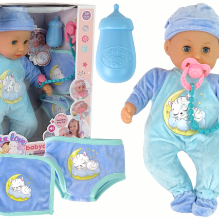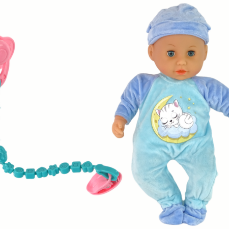 Lalka Bobas Dźwięk Smoczek Śliniaczek Niebieska Piżama Kotek Urocza lalka bobas zachwyci malucha. Zabawa będzie niezwykłym doświadczeniem, nauczy odpowiedzialności i empatii. Wymiar edukacyjny lalki zaprocentuje w przyszłości i pomoże wczuć się w ważną rolę, jaką jest opieka nad drugą osobą. Twoje dziecko uwielbia naśladować swoje kochające, troskliwe i opiekuńcze mamusie. Lalka ubrana jest w piękną, niebieską…