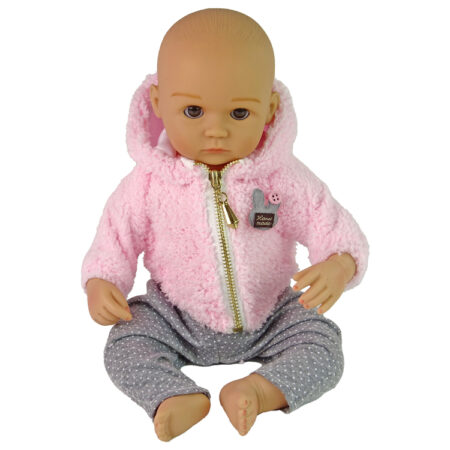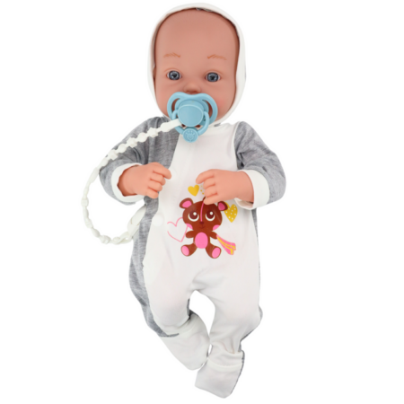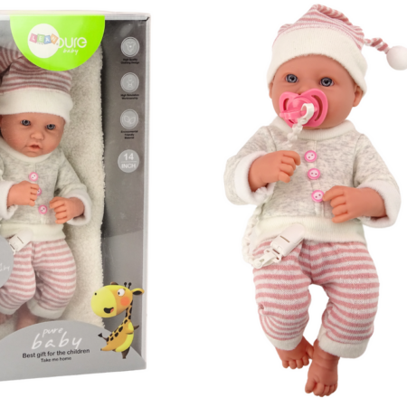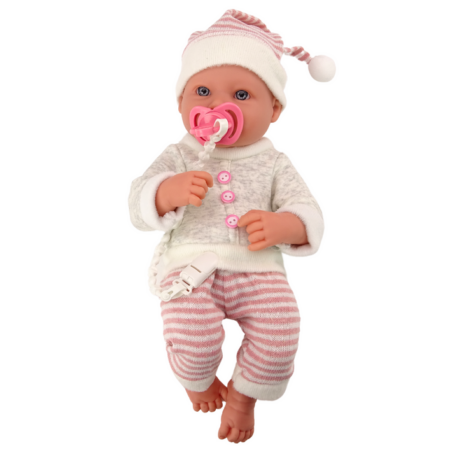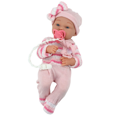Lalka Bobas Sweterek Czapeczka W Paski Smoczek Różowy Lalka bobas to doskonała towarzyszka dla każdej małej opiekunki. Ubrana jest w siwy sweterek z guziczkami, spodnie w różowe paski oraz czapeczkę z pomponem. Posiada ruchome rączki i nóżki, które można łatwo przestawiać i ustawić w różnych pozycjach, co dodaje realizmu i możliwości interakcji podczas zabawy. Ta…