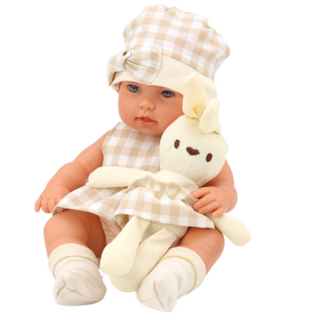 Lalka Bobas W Nosidełku Króliczek Ubranko w Kratę Beżowy Lalka bobas w nosidełku to wyjątkowa zabawka, która przenosi dzieci w świat opieki i troski o małego przyjaciela. Ubrana w uroczą sukieneczkę w beżowo-białą kratę, czapeczkę z kokardką i skarpetki, oraz z przytulnym pluszowym króliczkiem, lalka prezentuje się niezwykle uroczo i zachęcająco. Nosidełko wykonane z miękkiego…