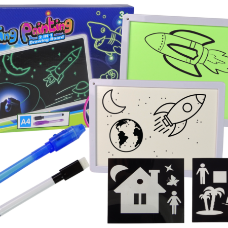 Dwustronna Magiczna Tablica Tablet Do Rysowania Glowing Painting 2w1 Narysuj i Podświetl ! Duży tablet tablica A4 do rysowania. Tablet jest przeznaczony do nauki pisania, malowania, notatek lub obliczeń. Tablica posiada panel do rysowania za pomocą magicznych flamastrów. Podświetlenie pisakiem LED dodatkowo wzmocni atrakcyjność wykonanych rysunków oraz sprawi, że będą świetnie prezentować się w przyciemnionym…
